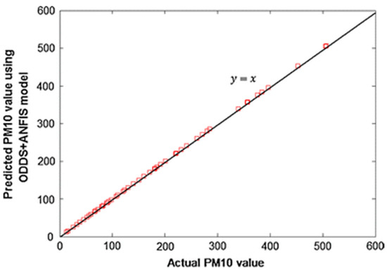 In fact, Domanska and Wojtylak applied the ANFIS model to forecast concentrations of CO, SO2, and especially PM10 and PM2.5 pollution. Meteorological data (e.g., time horizon, weather forecast, meteorological situation, and pollution concentration) in Poland were defined as inputs. It was estimated that the ANFIS model forecasted PM10 and PM2.5 concentrations for 24–36 h with the lowest error value [97]. In another study, Polat and Durduran predicted daily air pollution levels including PM10 concentrations in Turkey using a combined ANFIS/output-dependent data scaling (ODDS) network model [98]. PM10 forecast was contributed by meteorological variables (e.g., temperature, humidity, pressure, and wind velocity attributes) as input data, as training data, and actual PM10 concentrations from the air quality statistics database of the Turkish Statistical Institute. The combined ANFIS/ODDS model was demonstrated to be an effective PM10 prediction method (Figure 12).