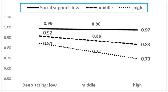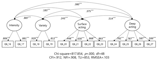 | Deep acting | −0.073 * | 0.035 | −0.052 | −0.068 | 0.035 | −0.049 | Customer contact | 0.274 *** | 0.028 | 0.228 | 0.264 *** | 0.028 | 0.220 |