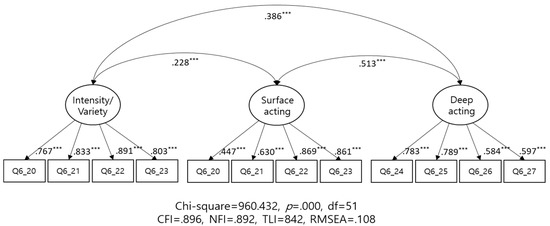 | 2. Surface acting | 0.247 *** | 0.393 *** | 0.263 *** | 0.212 *** | 0.391 *** | 0.051 * | 0.052 * | −0.030 | 0.363 *** | ||