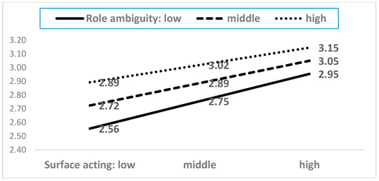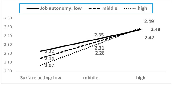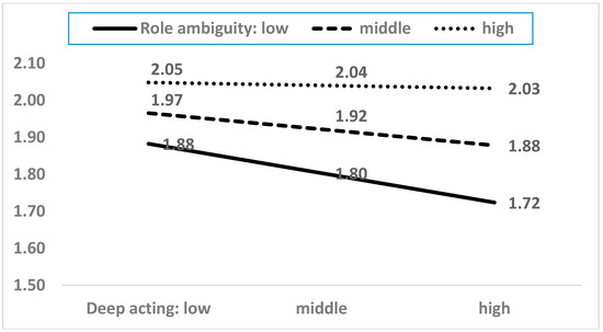 | Surface acting (IV) × Job autonomy (M) = Burnout (DV) | Deep acting (IV) × Role ambiguity (M) = Burnout (DV) | ||||||||||||