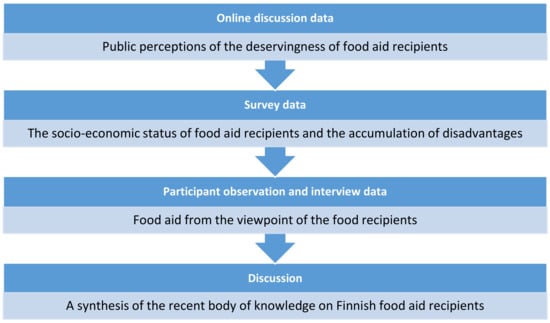 In the subsequent sections, we first present the findings from these different data sets and then draw a synthesis of this recent body of knowledge on Finnish food aid recipients: we discuss how they are perceived by the public, who they actually are, and how they themselves see their own social position and the phenomenon they are engaged in (Figure 1). In the discussion section, we discuss these combined findings to show how they raise some significant issues regarding food aid recipients.