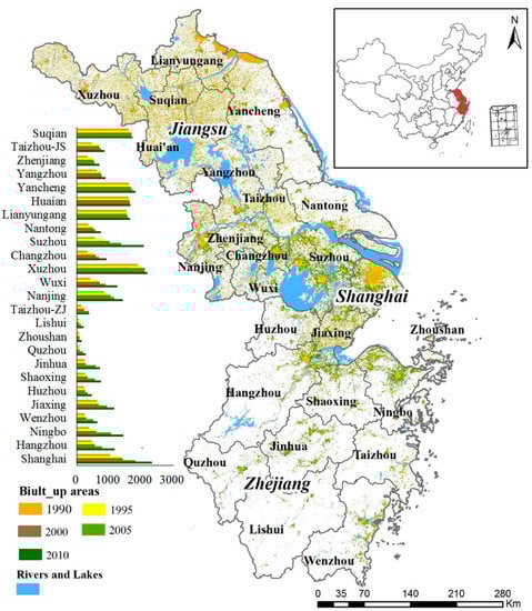 The geographical location of the Yangtze River Delta (YRD) in China. The expansion of built-up areas during 1990–2010 was also illustrated.