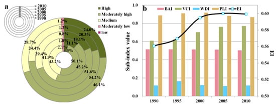 The EI area ratio of ecological conditions (a) and temporal variation of Eco_C and its sub-indexes (b) in the YRD during 1990–2010.