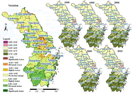 In more detail, as shown in Figure 3, the variation of the EI values in the YRD during the study period was spatially polarized, was mainly located in the South and midlands, and presented an obvious improvement of Eco_C. The regions with EI values that got worse were mainly distributed in Suzhou, Changzhou, Zhoushan and in the northern parts of Jiangsu province such as Lianyungang. Meanwhile, the regions with little change in ecological conditions accounted for about 40% of the whole region, which were mainly concentrated in Jiangsu province. The results were consistent with the findings of Yang et al. (2015) [16]. Similarly using the YRD as an example, Yang et al. (2015) found that nearly 46.2% of the YRD including the entire southern regions, showed an obvious amelioration, whereas there was a worse trend in the northern Jiangsu province.