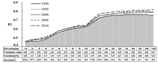 For the YRD, EI values increased at a comprehensive level with the increase of altitude during the study period (Figure 4). It was found that the areas with elevation below 10 m had the lowest Eco_C (EI = 0.46), and the areas with elevation above 1000 m had the highest EI value (0.82). In terms of EI changes during 1990–2010, the areas with an elevation below 10 m had the minimum variation, almost with no change to the ecological conditions during the study period. Besides, the areas with an elevation above 1000 m had the maximum change, and the variation and degree of change could reach 0.07% and 9.33%. It was mainly due to the fact that elevation often affected the spatial distribution of LUCC, which in turn affected the way humans utilized land resources [48]. The low-altitude areas were usually the main regions of wide built-up land and farmland, the Eco_C was greatly affected by human activities and its values were relatively low. While high-altitude areas were dominated by woodland, grassland and little arable land, with fewer human activities on land uses, thus the Eco_C was comparatively high. In addition, the WDI value had the largest change in the areas over 1000 m, with its variation and degree of change being 0.17% and 121.43% during 1990–2010, which lead to the Eco_C in these areas having the maximum change. Moreover, the EI value increased rapidly at an altitude of 100 m to 300 m, due to the rapid increase of the BAI and VCI values, namely vegetation, woodland and grassland cover increasing significantly in this interval.
