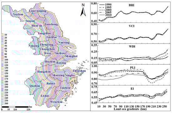 Figure 5 illustrates the comprehensive trend of land-sea gradient from 1990 to 2010 and the accordance with the four primary indicators. It exhibited an increasing fluctuation in the comprehensive level of land-sea gradients with the distance from the coastline during the study period. The ecological conditions over 10 km region away from the coastline was the lowest (EI = 0.48), with high urbanization level, rapid economic development and intense human activities [49]. The Eco_C for the 260 km region away from the coastline was the highest (EI = 0.71). This buffer zone was mainly located in Quzhou where it had the best ecological conditions, with its BAI, VCI, WDI and PLI all at the highest levels. In addition, the Eco_C reached a more pronounced high point at 90 km (EI = 0.61), with this strip mainly possessing some water areas such as Dianshan Lake and regions with high biological abundance such as Lishui, Hangzhou, Jinhua, and Wenzhou. However, at a distance of 200 km to 210 km, there was a concave low point (EI = 0.53), as this strip passes through cities such as Nanjing, Xuzhou, Huai’an and Suqian. The relatively low Eco_C were mainly restricted by the regional environmental pollutant loads and land use types [16].