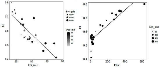 For the natural conditions, there was an obviously positive relationship between Elev and EI (average r = 0.86) (Table 3 and Figure 6). This result was similar with that showed in Nguyen et al. (2016) [32], which concluded that the variation in altitude had the largest impact on the eco-environmental vulnerability (61.1% in total). Moreover, elevation differentiation had a significant effect on transportation, evapotranspiration and other processes that may affect Eco_C [54]. However, the relationship between land-sea gradient and EI was not apparent (p > 0.05), which indicated that the influence of the distance far away from the coastline on EI was very limited in the YRD. Moreover, due to all the cities in the YRD being very close to the coastline, the Dis_coa had the smallest impact. The spatial variability of Eco_C in the YRD depended strongly on Urb_rate with an average negative correlation of 0.76 (p < 0.01). Meanwhile, there was also a negative relationship between EI and Per_gdp (average r = −0.46), although the correlation was not significant enough (p > 0.05). The results indicated that the urban population growth and increased income had important influences on the spatial pattern of Eco_C. A similar study was also undertaken by He et al. (2017) [2], which confirmed the importance of the interaction between Eco_C and its influencing factors such as income and urbanization rate (population growth) in regional sustainable development. However, the relationship between Per_ind and EI was insignificant (p > 0.05), which indicated that the impact of Per_ind on EI variability was very limited. Our findings support the view that policy makers should pay more attention to the impact of income and population in framing urbanization development policies.