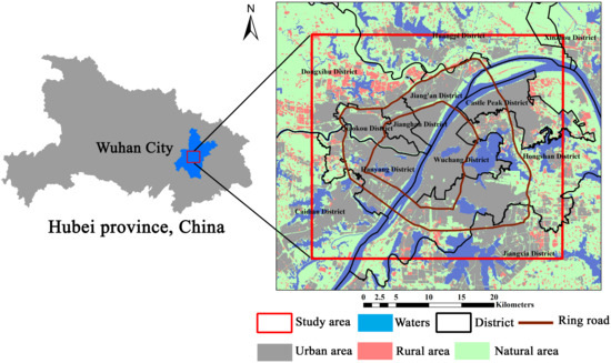 The thermal infrared band of the TIRS remote sensing image of Wuhan is introduced into ENVI software (5.3, Harris Corporation, Melbourne, FL, USA). This is the basic data source for urban heat island analysis. While using ArcGIS software (10.2, Environmental Systems Research Institute, Redlands, CA, USA) to convert the required vector data to raster data, a basic image database is established, in a unified format, using the ENVI remote sensing software.