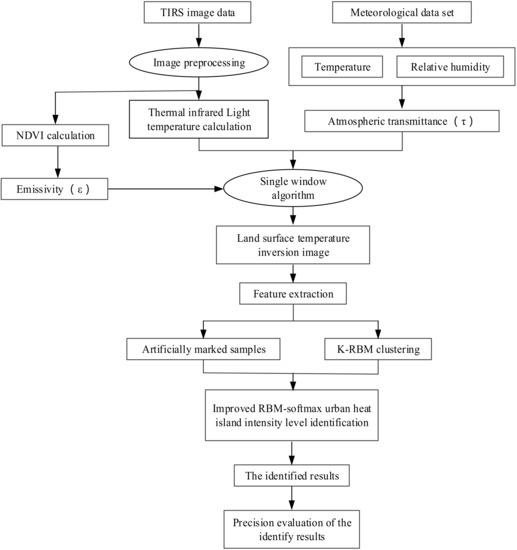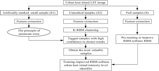 The core steps of urban heat island intensity level identification include land surface temperature inversion, K-RBM clustering (K means clustering of RBM), improved RBM, and reconstruction of urban heat island intensity levels based on the improved RBM. First, the image is pre-processed with the 2016 TIRS data images (23 July 2016, Goddard Space Flight Center, Greenbelt, MD, USA), with the Landsat 8 satellite (National Aeronautics and Space Administration, Washington, DC, USA) as the data source. The projection mode is the Universal Mercator Projection, WGS (World Geodetic System) 1984/UTM (Universal Transverse Mercator) Zone 49N, and the resolution resampling is 30 m by cubic convolution method. Then, in accordance with Rozenstein [30], the single window algorithm can be used for urban land surface temperature inversion. After land surface temperature inversion, K-RBM clustering is performed. The samples with a high confidence level are marked in the clustering result. Based on the principle of minimum error, the most valuable sample set is composed of samples with an artificial mark, which were entered into the improved RBM-softmax urban heat island intensity level identification method. During training, the model parameters are determined by the steepest descent method until convergence, thus finally obtaining the identification results, and the accuracy of the classification is calculated. The core flow of the urban heat island intensity level identification process is shown in Figure 2.