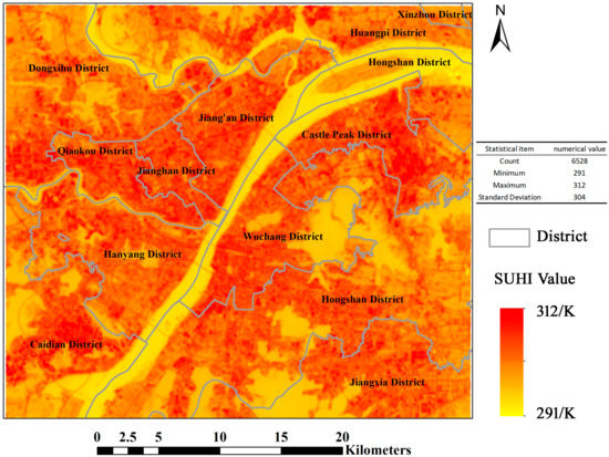 Spatial distribution of the surface urban heat island (SUHI) in Wuhan.