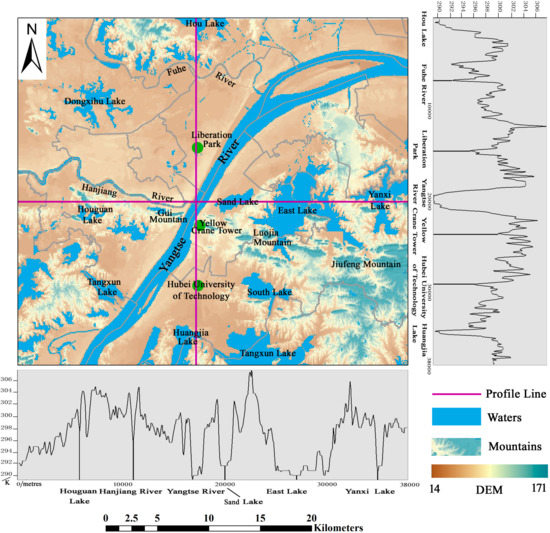 The land surface temperature profile for the east–west line in Wuhan, starts from Houguan Lake, through the Hanjiang River, Yangtze River, Sand Lake, East Lake, until Yanxi Lake and its surrounding farmland. In the land surface temperature profile from the east–west in Wuhan, a high, a middle, and a low are shown on both sides of the characteristics. This indicates the existence of urban heat island phenomenon. In addition, the east–west profile has the Yangtze River as its center. The temperature range on both sides of the east–west profile is asymmetric. The main reason for this is that the west area of urban buildings is widely distributed, while the east region of the river area is widely distributed.