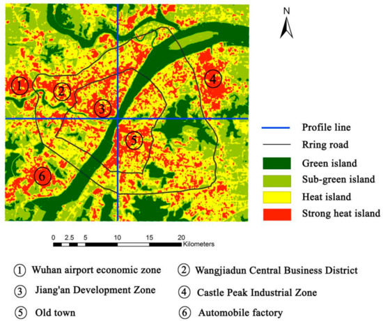 The green island is mainly distributed in the Yangtze River, Han River, East Lake, Sand Lake, Tangxun Lake and other water areas of Wuhan. The sub-green island is mainly distributed in Wuhan Jiufeng Mountain, Luojia Mountain, Guishan and other mountains, Yellow Crane Tower, Liberation Park, Evergreen Park and the surrounding areas of farmland and other areas. The hot island is located in the central city of Wuhan and has a large distribution area. The boundary between the heat island and green island, the sub-green island, has a clear line, forming a sharp contrast. The strong heat island is mainly distributed along the Castle Peak Industrial Zone, Wuhan Airport Economic Zone, Jiang’an Development Zone, Wangjiadun Central Business District, the automobile factory area and urban residential intensive areas of Wuhan.