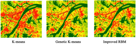 The improved RBM identification algorithm was compared with two other models: K-means clustering and genetic K-means clustering [35]. All three models were tested 100 times, and the optimal results were taken. The comparative analysis of three-model is shown in Table 5 and Figure 7, respectively. Under the same experimental conditions, the improved RBM identification algorithm has the highest classification accuracy, with a total accuracy of 93.31% and a Kappa coefficient of 0.8861, which are higher than those for the K-means clustering algorithm and genetic K-means clustering. Among the three algorithms, the improved RBM identification algorithm had the shortest run time at 0.72 s. The genetic K-means clustering algorithm was the second best; however, the K-means clustering had the worst performance. K-means clustering algorithms easily fall into the phenomenon of local optimization because the initial clustering center is more sensitive, so the generated image clustering effect is poor. The differences between the internal temperatures of the city are not obvious, and it cannot achieve the research goals. However, the genetic K-means clustering algorithm does not fall into the local optimum. The algorithm has a good classification effect, and the computational efficiency is higher than that of the K-means clustering algorithm. Compared with the K-means and the genetic K-means, the improved RBM identification algorithm is more obvious in terms of the division of the temperature levels within the city, and the boundary of the categories are obvious. The clustering result of the algorithm can meet the research goal of determining the spatial distribution of the heat island effect within the city. This research method is more practical.