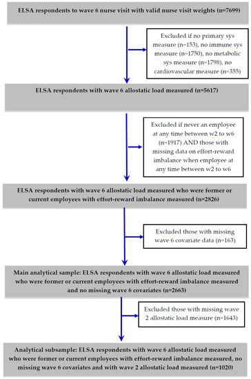 The main analytical sample in this study (see Figure 1) was derived from the ELSA wave 6 nurse visit sample (n = 7699), out of which 5617 respondents had their allostatic load index score measured at wave 6. Among this group 2826 respondents were an employee at least once between waves 2 and 6 and had a measurement of ERI when they were an employee. The main analytical sample further reduced to 2663 when missing covariates were deleted from the sample. From this main analytical sample, a subsample of 1020 respondents had their allostatic load measured at wave 2.