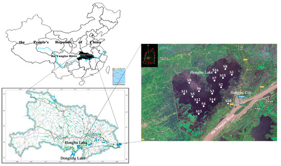 Honghu Lake, the biggest natural wetland in the Hubei Province, lies in Jianghan Plain between the Yangtze River and Han River (Figure 1). The lake has polygonal shape with an area of about 344 km2 (29°39′–30°02′ N; 113°07′–114°02′ E). It is 23.4 km from east to west and 20.8 km from north to south with the coastline length of 1354 km. The average depth of the lake is about 1.34 m, with the maximum depth of 2.30 m. Honghu Lake has a north subtropical humid monsoon climate with the annual average temperature of 15.9–16.6 °C, and the annual average rain precipitation is 1000–1300 mm. With rapid development of the local economy, Honghu Lake was polluted by heavy metals to some extent, due to massive discharge of wastewater from industrial, domestic and agricultural sources from Honghu City and Jianli City [28,31,32].