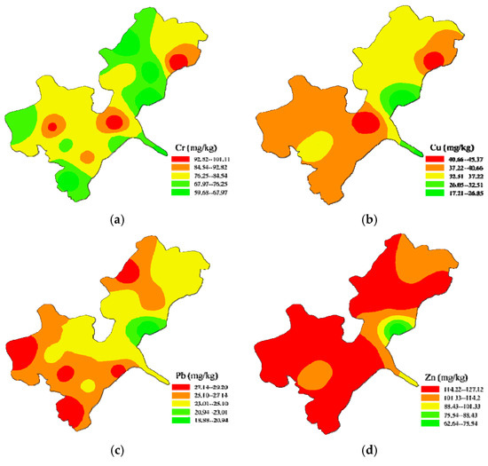 For , the Hakanson recommended values of Cr, Cu, Zn, Pb and Cd are 2, 5, 1, 5 and 30, respectively [19]. For , soil background values for Hubei Province were used as a reference, and the values of Cr, Cu, Zn, Pb and Cd were 86.0 mg/kg, 30.7 mg/kg, 83.6 mg/kg, 26.7 mg/kg, and 0.172 mg/kg, respectively [44]. Five levels of are defined by Hakanson, as shown in Table 1.