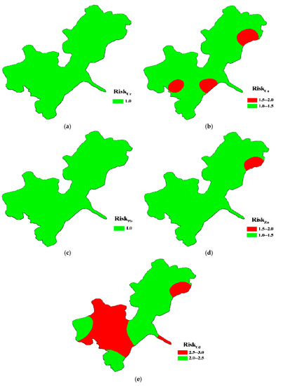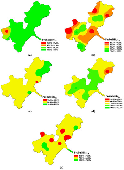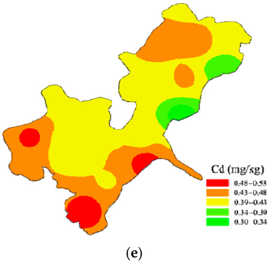 Probability subjection mapping of comprehensive risk of: Cr (a); Cu (b); Pb (c); Zn (d); and Cd (e).