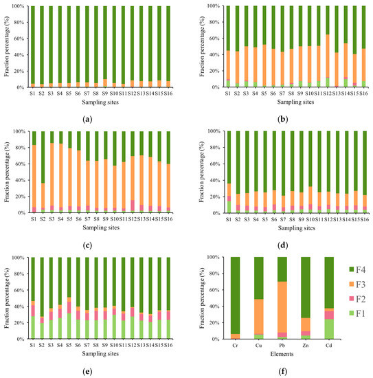Heavy metal chemical fraction percentage of: Cr (a); Cu (b); Pb (c); Zn (d); Cd (e); and (f) all elements summary (F1: acid-extractable fraction; F2: reducible fraction; F3: oxidizable fraction; F4: residual fraction).