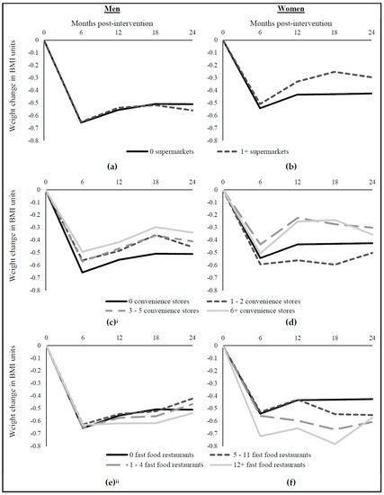 Figure 2 illustrates these effects of MOVE! on BMI change at 6, 12, 18, and 24 months for both men and women with different access to supermarkets, convenience stores, and fast food restaurants, respectively.