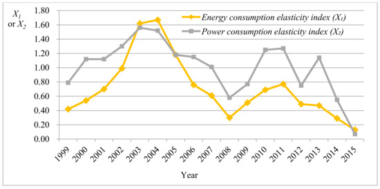 As shown in Figure 1, the fluctuation trend of the energy consumption elasticity index was similar to that of the power consumption elasticity index overall. The two indexes both rose to a peak around 2003, then gradually declined, before increasing after reaching the minimum in 2008 (global financial crisis), and finally reached the peak in 2011. Following this, a new cycle began.