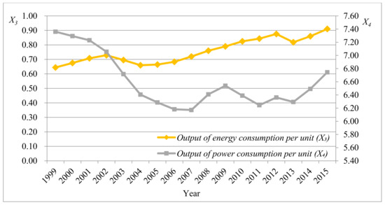 In Figure 2, the output of energy consumption per unit generally exhibiting a rising trend except for the slight decrease in 2003 and 2013, which indicated that China’s energy utilization rate was increasingly high and the output efficiency significantly improved. The output of power consumption per unit constantly decreased from 1999 to the minimum in 2007, then fluctuated and constantly rose from 2013.