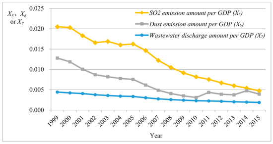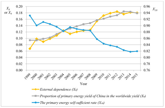 It can be seen that the maximum and minimum of all indexes existed within a reasonable interval and the mean of indexes was far larger than the standard deviation, implying that there was a low dispersion degree of data. Moreover, the probability with the extreme outlier was at a low level. The mean, median, and mode of the dust emission amount per GDP were close to those of the wastewater discharge amount per GDP , indicating that the data of the two indexes were approximately symmetrically distributed. It can be speculated from the skewness that the data of power consumption elasticity index , external dependence , proportion of primary energy yield in the worldwide yield , and primary energy self-sufficient rate were left-skewed distributed. The other index data were right-skewed distributed. Figure 1, Figure 2, Figure 3 and Figure 4 separately display fluctuation trends of performance indexes concerning external economic and social responsibility.
