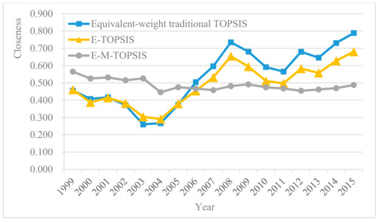 It can be speculated from the table that the presence of the correlation between indexes leads to sorting results of the external performance of energy regulations calculated using two different appraisal methods that havei a significant disparity. The E-M-TOPSIS method considering the correlation between the performance indexes concerning external economic and social responsibility exhibits a lower relative closeness degree compared with the E-TOPSIS method due to avoiding the information overlap problem. This also implies that the correlation between indexes cannot be ignorable to some extent. Therefore, due to taking the correlation between various performance indexes into account, the M-TOPSIS method can truly show the external performance characteristic of the energy regulation and reflect the performance level of energy regulation. On this basis, the method can be used for scientific decision-making formulations. Figure 5 shows the fluctuation trends of corresponding relative closeness degrees of three different appraisal methods for the external performance of energy regulation.