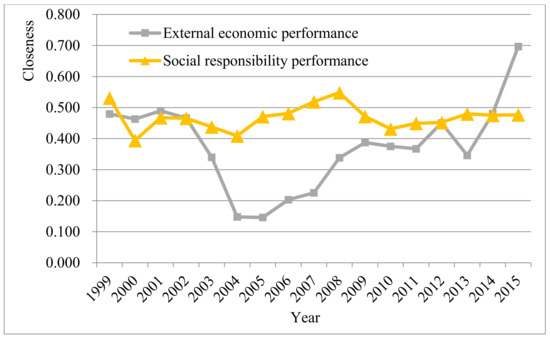 As shown in Figure 5, the traditional TOPSIS method enlarges the fluctuation interval of the relative closeness degree and increases the fluctuation amplitude of relative closeness degree to some extent because it cannot effectively address the information overlap problem. However, the E-M-TOPSIS method avoids information overlap and causes the relative closeness degree within a fluctuation interval to have a lower amplitude. Meanwhile, the method softens the closeness level to further acquire performance appraisal results reflecting the true level of energy regulation based on independent performance indexes. Figure 6 shows fluctuation trends of external economic and social responsibility performances obtained using the E-M-TOPSIS method. To be specific, the external economic performance dramatically fluctuates with a great fluctuation amplitude and it rose rapidly and unevenly after reaching the wave trough (the minimum value) around 2004 and 2005 (year). Moreover, the increase sped up in 2013 with the constantly deepening reform of China’s energy regulation institutions. However, the social responsibility performance maintained a relatively stable fluctuation with an interval. It can be seen that the fluctuation of the external economic performance is more sensitive to energy regulation than the social responsibility performance.