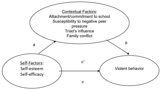 Statistical analyses were conducted using IBM SPSS version 23 (SPSS Inc., Chicago, IL, USA). Descriptive statistics of the variables and psychometric properties of the measurement scales were checked to ensure acceptable reliability and validity. For analysis of differences in violent behaviors reported by the school students and youth offenders, t-tests and multivariate analysis of variance (MANOVA) were conducted on the summative violence score (for t-tests) and each of the violent behaviors (for MANOVA). Hierarchical regression analyses were conducted to test the predictive effects of the self and contextual variables. Demographic variables including age, gender, place of birth, and religion were entered in the first step as controls, and other predictors (self-esteem, self-efficacy, susceptibility to negative peer influence, attachment/commitment to schools, Triad gang’s influence, and family conflict) were entered in subsequent steps to check for the additional variance explained. To analyze the mediating effects, the widely used approach suggested by Baron and Kenny [55] was employed. The conceptual path model of the mediating analysis is displayed in Figure 1. As a precondition for considering mediating effects, the paths a, b, and c must be statistically significant. Should there be mediating effects, the direct effect (path c’) of the independent variable on the dependent variables shall be reduced significantly when the mediating variables are controlled. The indirect effect of independent variable (IV) on dependent variable (DV) through mediating variable (MV) shall be indicated by the function of a∙b, and its significance is then checked by the Sobel test and the confidence intervals (CI) under bootstrapping. The Process macro [56] was used to conduct the mediating analyses.