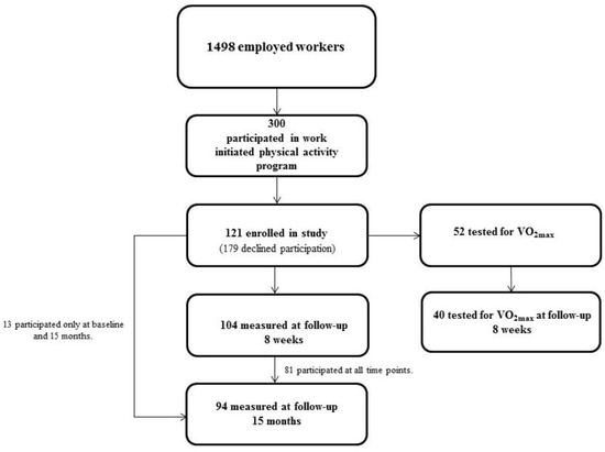 A detailed description of the cohort has been presented elsewhere [20,21]. Briefly, a subgroup of 121 individuals from a road maintenance company with altogether 1498 workers throughout Norway, were enrolled in the study (Figure 1). The initial cohort consisted of 78 men (64%) and 43 women, with a mean age of 41.8 years (SD 12) and 42.6 years (SD 12.5), respectively. Among these participants, 86% of the women and 53% of the men reported college or university education. All but two women were office workers, while 29 men (24% of the total group) were road workers (see Table 1). The examinations took place before the start of eight weeks of PA in September 2014 (baseline), after the PA-period (8-week follow-up) in November/December 2014 and then in November/December 2015 (15-month follow-up). The Regional Ethics Committee in Oslo (2014/1521) approved of the study. All participants were informed about the study and gave written consent to participate.