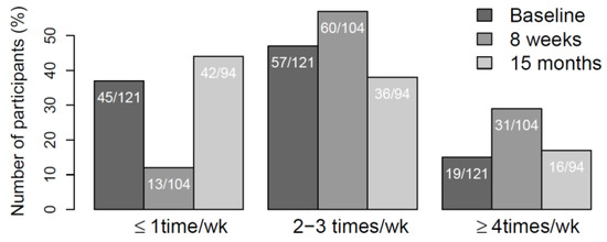 After the initial increase seen at the 8-week follow-up, levels of PA returned to baseline values (Figure 2). At the final follow-up (15-month), 60 participants reported to have the same activity level as compared to baseline values, 16 reported more, and 18 less activity. Compared to the 8-week follow-up, 43 participants had the same activity level, six had more and 32 had less activity. At the final follow-up (15-month), the group reported a mean weekly low/moderate and high PA of 240 min (SD = 257) and 123 (SD = 135), respectively.