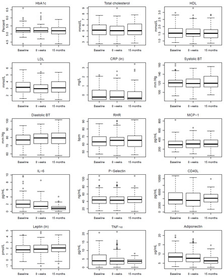 Changes in HbA1c, lipids, CRP, Blood pressure, RHR and selected biomarkers according to time; baseline, 8-week follow-up and 15-month follow-up. Plots are based on participants observed at all three time points.