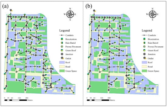 Under this scenario, the primary consideration was to maximize the LID’s effectiveness. Four types of LIDs (rain barrel, bioretention, porous pavement, and green roof) were placed in all suitable locations according to the actual conditions, to enhance stormwater control performance. The MaxPerf scenario included 13 rain barrel sites, five bioretention sites, 18 porous pavement sites, and 35 green roof sites (Figure 2a).