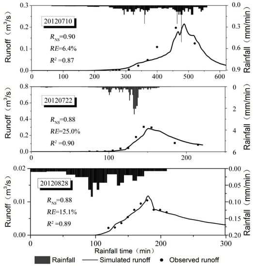 Comparison between the simulated and observed values in SUSTAIN for three rainfall events. RNS is Nash–Sutcliffe coefficient; RE is relative error, and R2 is coefficient of determination.