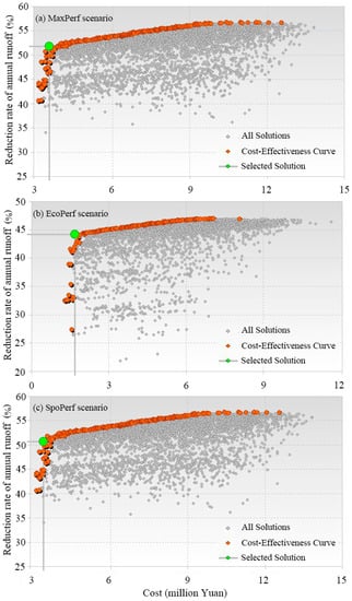 In the cost-effectiveness curve, the X axis represents the total cost, and Y axis represents the annual runoff volume reduction rate of LIDs compared to the PostDev scenario. Each point in the figure represents a possible solution in the optimization process. The red points represent the cost-effective solutions. The best solution is the “knee-of-curve” point and the green point is the selected solution for each scenario.