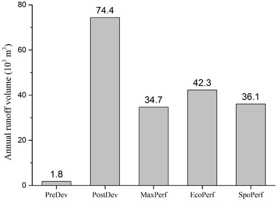 The performances of five scenarios described above were simulated using SUSTAIN. For the present study, the target indexes for evaluating system performance were total annual runoff volume and pollutant loads. The results showed that the annual runoff volume of PostDev scenarios increased by 72.6 million m3 (40 times) when compared to the PreDev scenario, clearly indicating the negative impacts of urbanization (Figure 5). The three designed LID scenarios could effectively reduce approximately half of the annual runoff. The most effective scenario is MaxPerf, which reduced 53.4% of annual runoff of the PostDev scenario, followed by the SpoPerf (51.5%) and EcoPerf scenario (43.1%). However, these three LID scenarios could not reduce annual runoff to the same level as before development (PreDev scenario). The runoff control efficiency of the MaxPerf and SpoPerf scenarios increased by 23.9% and 19.5% compared with the EcoPerf scenario; however, the costs increased by 104.4% and 83.6%, respectively (Table 4).