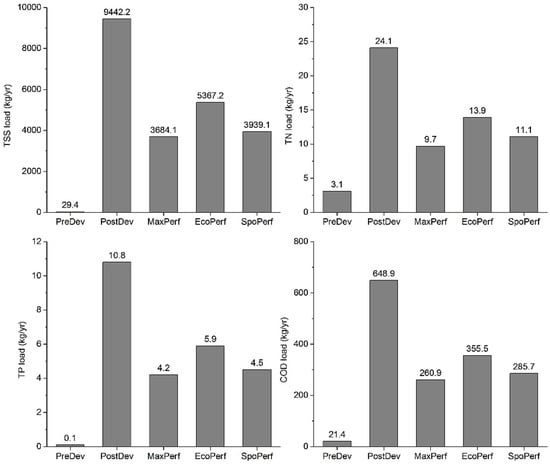 In this study, reducing annual runoff volume is the goal of LID optimization, but the discharge of non-point source pollutants is also reduced as runoff is reduced. Concentrations of TSS, TN, TP, and COD in runoff increased from the PreDev to the PostDev scenario (Figure 6). However, the simulation results demonstrated that by properly designing and implementing LID measures for the study catchment, significant reductions in non-point pollution could be achieved. For pollutant load, the reduction rate of four pollutants under the MaxPerf scenario was 59.8–61.1%, followed by the SpoPerf scenario (53.9–58.3%) and the EcoPerf scenario (42.3–45.4%), and the costs of the three scenarios were 3.74, 3.47, and 1.83 million Yuan, respectively. For all three LID scenarios, TP had the largest reduction rate, and TN had the smallest reduction rate.