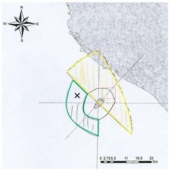 Location of the offshore platform, as proposed by the stakeholders (black cross: proposed location, black circle: 3 nautical miles radius, red square: initially proposed location, green area: suitable area for OTEC (ocean thermal energy conversion), yellow area: fishing grounds).