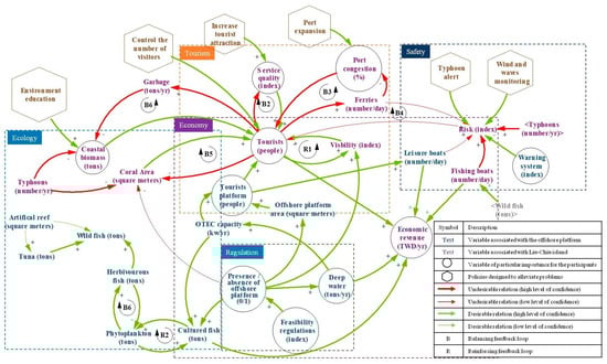 The stakeholders’ initial opinions regarding the multipurpose offshore platform changed after the GMB process. Their study of the CLD greatly improved their understanding of systemic effects, and as a result, their explanation of potential effects became more complex. Table 4 lists the differences in opinions of the stakeholders from before and after the GMB activity. Originally, the stakeholders stated that constructing the platform would benefit tourism in Liu-Chiu and that only fisheries and transportation would be negatively affected. However, after applying the systems thinking approach to construct the CLD, the stakeholders realized that increasing the number of tourists would overload local tourism resources and degrade the ecosystem of Liu-Chiu and that countermeasures were necessary.