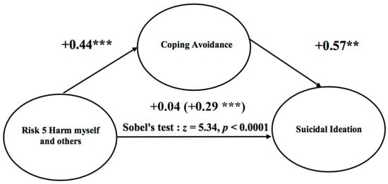 The effect of Risk 5 Harm myself and others for Suicidal Ideation after controlling for Coping Avoidance. The number in parentheses indicates the direct effect of Risk 5 on Suicidal Ideation prior to controlling for Coping Avoidance. ** p < 0.001. *** p < 0.001.
