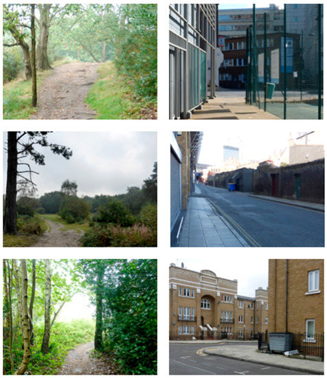 The slideshows were a series of still images, presented sequentially to represent a walk through either a natural environment (woodland and heathland in Southern England) or an urban environment (streets in London, England). Example images are reproduced in Figure 1. A research assistant at the University of Surrey created these slideshows from photographs taken between September 2014 and March 2015. No people were visible in either slideshow, which were matched for visual structure using a storyboard approach; for example, if the woodland path turned right, so did the road; if tall buildings framed an urban image, then tall trees framed the corresponding nature image. There was no soundtrack for either slideshow, as the perceived quality and content of soundscapes may interact with the restorative experience [49,50].