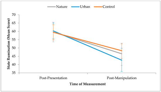 Effect of time on state rumination by condition. Error bars represent 95% confidence intervals.