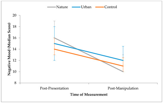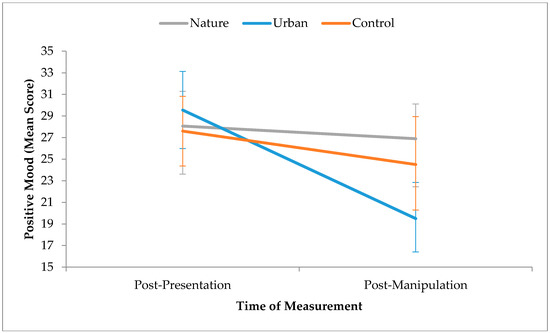 Simple effects analysis showed no significant difference between conditions on positive mood at post-presentation, F(2,55) = 0.35, p = 0.71, but there was a significant difference between conditions at post-manipulation, F(2,55) = 3.55, p = 0.035, partial η2 = 0.11. Contrasts revealed the effect of time was significant in the urban, F(1,55) = 56.50, p < 0.001, partial η2 = 0.51, and control conditions, F(1,55) = 5.37, p = 0.024, partial η2 = 0.08, but not the nature condition, F(1,55) = 0.68, p = 0.41, partial η2 = 0.01. Environmental exposure therefore significantly influenced changes in positive mood over time. Participants in the urban condition reported a large and significant decrease in positive mood, whilst participants in the control condition reported a medium and significant decrease. Participants in the nature condition, however, reported only a small decrease in positive mood, and the effect was non-significant.