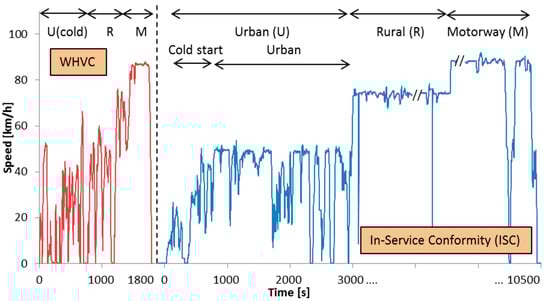 Test cycles: WHVC (World Harmonized Vehicle Cycle) and an example of an ISC (In-Service Conformity) cycle (plotted in the same figure for illustrative purposes). Note that parts of the rural and motorway phases have been cut for better visualization.