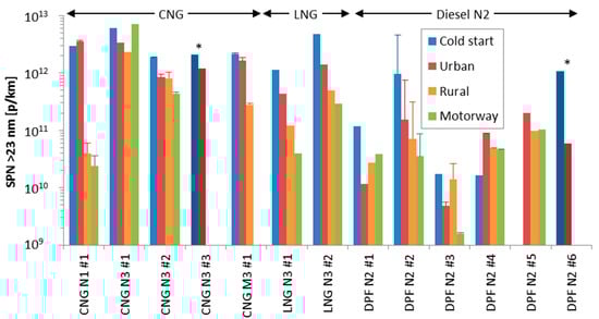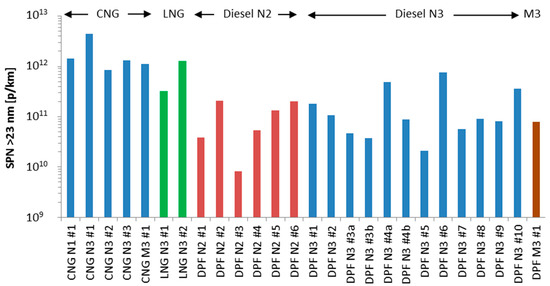 The weighted emissions of the vehicles (14% cold start emissions and 86% mean value of urban, rural, and motorway emissions) are presented in Figure 2. The CNG and LNG vehicles range from 3.3 × 1011 to 4.5 × 1012 p/km. One of the LNG vehicles is lower than the assumed SPN limit 6 × 1011 p/km. The rest vehicles are higher by a factor of 1.4 to 2.4, with one exception (CNG N3 #1: 4.5 × 1012 p/km), that is 7.5 times higher. The specific vehicle had <3000 km and the lubricant contribution could be higher. The diesel vehicles (all with DPFs) ranged from 8 × 109 to 7 × 1011 p/km. No particular trend can be seen for the different categories (trucks or buses, N2 or N3).