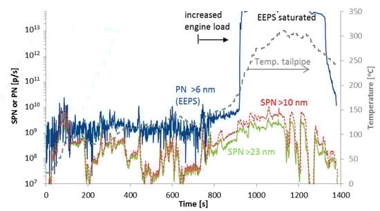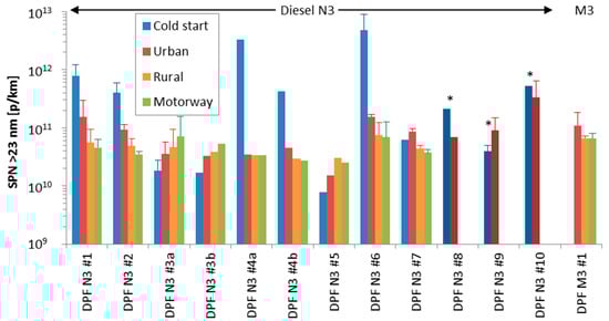 However, the SPN emissions during cold start are not always higher at lower temperatures (see e.g., DPF N2 #4 of Figure 6 (or [52]). The DPF fill state plays the most important role and determines the efficiency of the DPF. For example, a study with two DPF equipped heavy-duty vehicles showed that the emissions immediately after a regeneration event were >5 × 1012 p/kWh and dropped to <1 × 1011 p/kWh after 5 test cycles [76], clearly demonstrating the importance of the soot cake of the DPF on its efficiency. The tests in this paper were not controlled in terms of DPF load state.