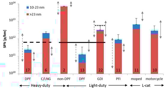 Overview of emission levels of different current vehicle categories, based on this study for the heavy-duty vehicles and the literature for the rest [53,66,67]. Dashed arrows on the left of the bars show reported range of an older SPN review [35]. Arrows on right shows suggested emission factors based on [68]. Error bars show one standard deviation (only positive side) for the number of vehicles shown in each bar. Horizontal lines give the European regulated SPN limits for SPN >23 nm. Note that for the GDIs of this figure the limit was 6 × 1012 p/km (dotted line). The dashed line shows a limit of 6 × 1011 p/km. However, the SPN limit applies only to heavy-duty engines (not vehicles) and is expressed in p/kWh. All tests at temperatures around 23 °C.