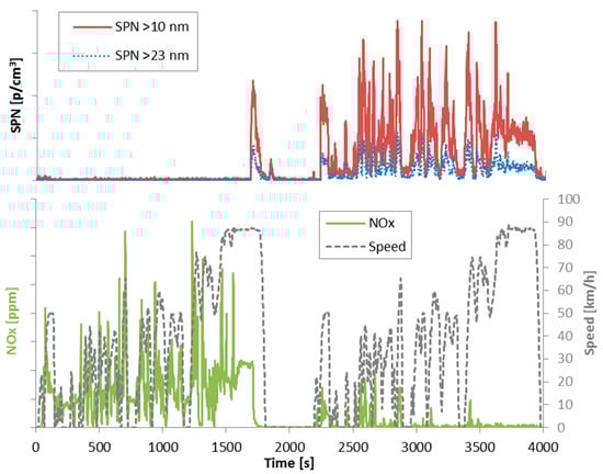 However, the SPN cold start emissions are not always higher than the hot emissions, especially when the emission levels are <1011 p/km (see for example DPF N2 #4, DPF N3 #3, #7, #9). In these cases the SCR system is downstream of the DPF and the emissions increase when the exhaust gas temperature has reached the appropriate range and urea is injected. Figure 5 shows two WHVCs one after the other (the first one with cold engine start). Although at the beginning there are almost no particles, when NOx emissions decrease (due to urea injection), the SPN concentration increases. According to the literature, in addition to the formation of nitrates and sulfates [55], these particles originate from isocyanic acid polymerization, urea pyrolysis and urea micro-explosions [54]. This explains why in some cases the cold start SPN emissions are lower than the hot start. Note also the high concentration of sub-23 nm particles, indicating that the mean size of the formed solid particles is lower than 20 nm.