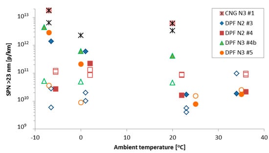 Figure 6 presents the effect of ambient temperature on SPN emissions. Beginning with the hot engine start (open symbols) of the DPF vehicles, the emission levels are relatively flat (i.e., similar levels within experimental uncertainty) indicating no influence of the ambient temperature. This is expected, as long as the cylinder, lubricant and after-treatment devices have reached their operation temperature, and as long as the engine strategy does not change (e.g., Exhaust Gas Recirculation (EGR)).