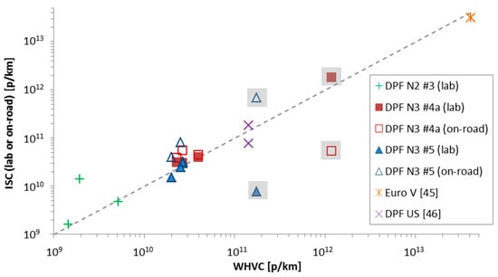 In general, there is an acceptable agreement between the different phases of different cycles (e.g., rural WHVC vs. rural ISC), but not always. For some cases the cold start emissions of the ISC cycles (points in grey background in Figure 7) are lower than the WHVC cold start emissions. This could be partly due to the smoother driving on the road. However, probably the DPF load state plays the most important role and determines the emission levels.